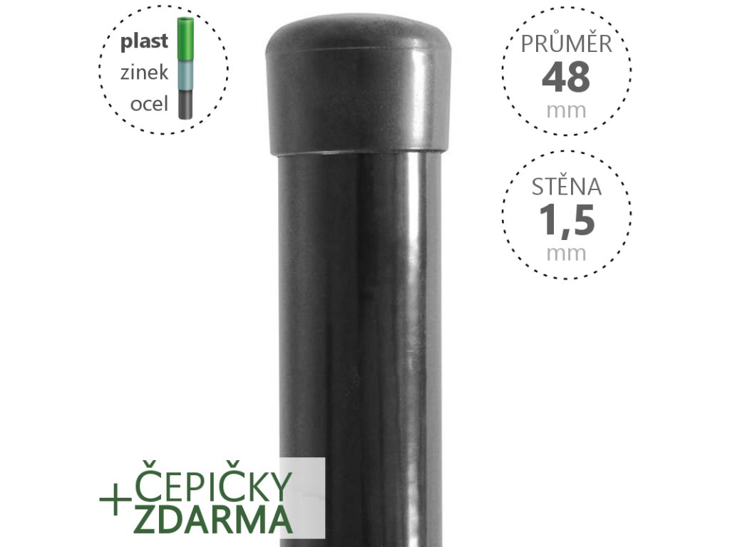 Plotový sloupek Damiplast, barva RAL 7016 (antracit), povrchová úprava Zn + PVC, průměr 48 mm, síla stěny 1,5 mm / s poplastem 2,0 mm, včetně čepičky. Výška dle výběru.