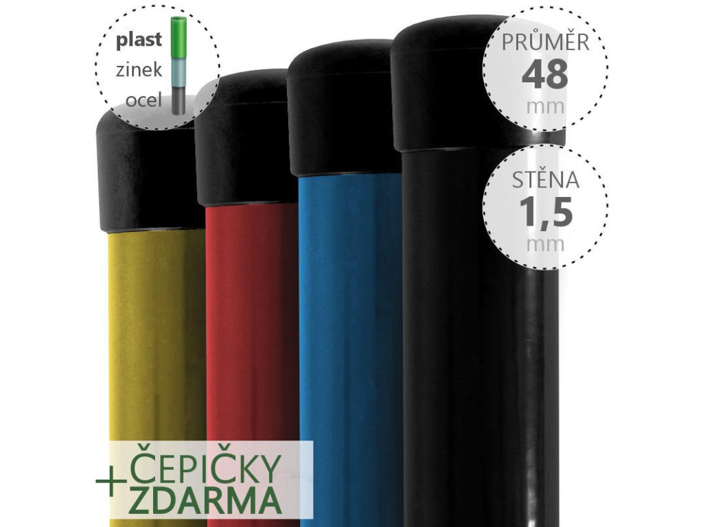 Plotový sloupek Damiplast, barvy červená, modrá, žlutá, bílá, černá, povrchová úprava Zn + PVC, průměr 48 mm, síla stěny 1,5 mm, včetně čepičky. Výška dle výběru.