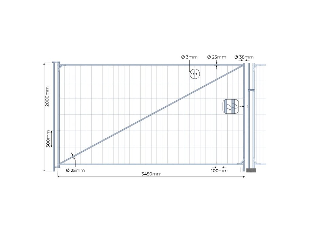 Brána jednokřídlá pro mobilní oplocení o rozměrech 3500 x 2000 mm se Zn povrchovou úpravou. Oka 100 x 300 mm, výplň svařovaný drát. Jednokřídlá brána vhodná k dočasnému oplocení.