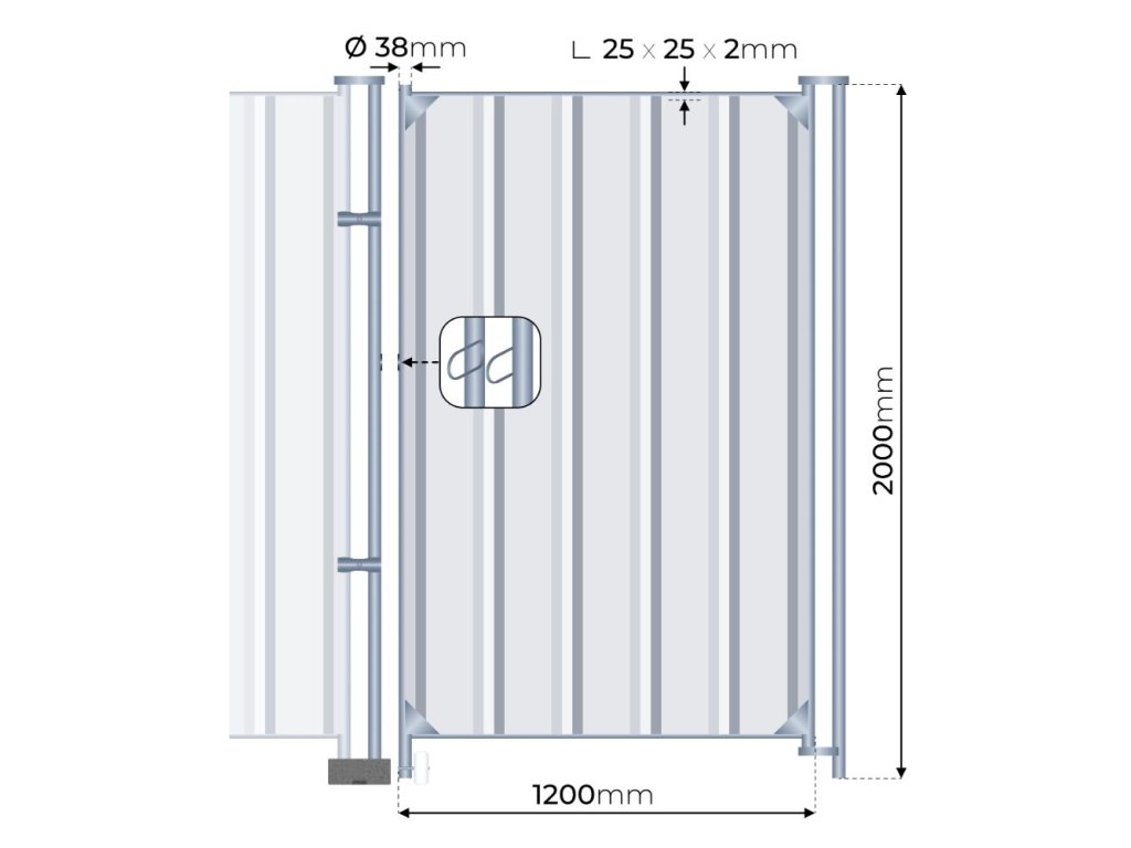 Branka jednokřídlá pro mobilní oplocení vyplněná trapézovým plechem o rozměrech 1200 x 2000 mm. Povrch je silně zinkovaný. Díky výplni je celá branka velmi pevná.