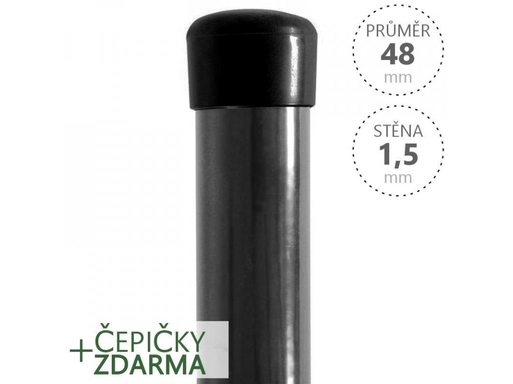 Plotový sloupek Ideal, barva RAL 7016 (antracit), povrchová úprava Zn + PVC, průměr 48 mm, síla stěny 1,5 mm, včetně čepičky. Výška dle výběru.