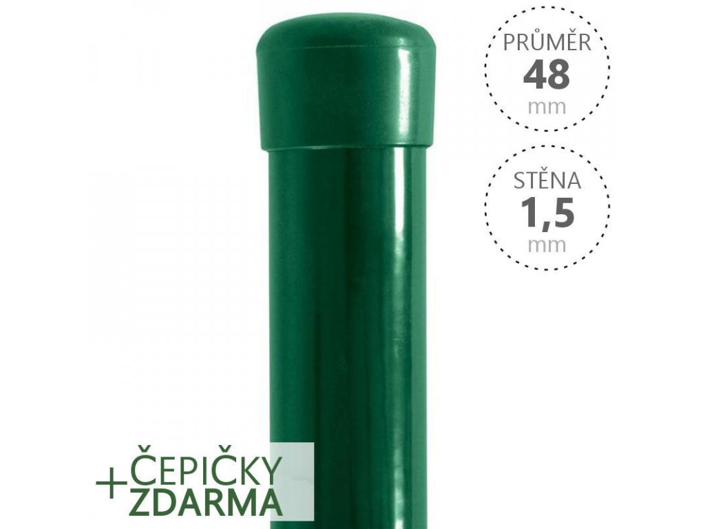 Plotový sloupek Ideal, barva RAL 6005 (zelený), povrchová úprava Zn + PVC, průměr 48 mm, síla stěny 1,5 mm, včetně čepičky. Výška dle výběru.
